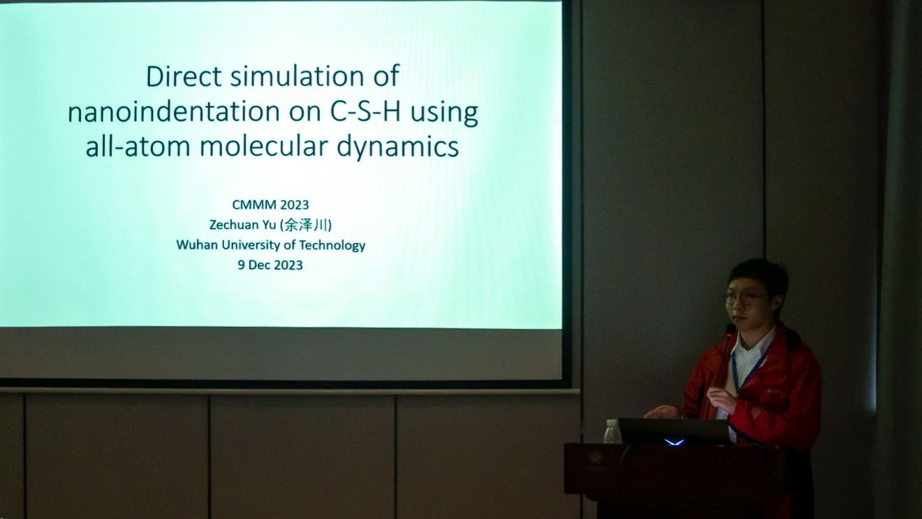 2023年12月8-10日,第五届力学和材料建模计算国际会议(CMMM2023)在广西南宁举行,冰球官网青年教师余泽川博士在MS04分会场作报告,分会场主题为:先进混凝土材料和结构的多尺度建模方法(Multiscale Modeling of Advanced Concrete Materials and Structures),余泽川博士报告主题为:基于全原子分子动力学模拟水化硅酸钙的纳米压痕试验(Direct simulation of nanoindentation on C-S-H using all-atom molecular dynamics simulations)。