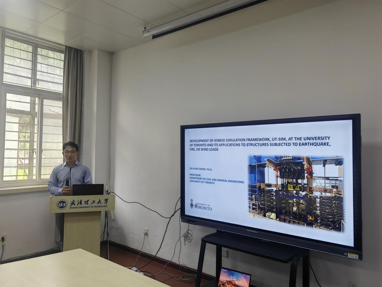 6月11日下午3:00,Kwon教授专题讲座在东教116会议室举行,由吴斌院长主持,建工系杨格副教授、郑华冬副教授等青教师以及相关专业研究生参加了座谈交流。Kwon教授作了关于“Recent developments of UT-SIM framework and its application to structures subjected to earthquake, wind, and fire”的学术报告,介绍了所开发的混合试验软件UT-SIM、在多伦多大学试验室改造和建立的大型试验加载设备,以及高层抗风、抗火和抗震混合试验研究成果。与会师生和Kwon教授进行了热烈的讨论,Kwon教授对师生提出的问题进行了细致解答。