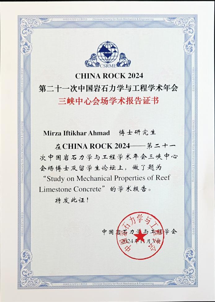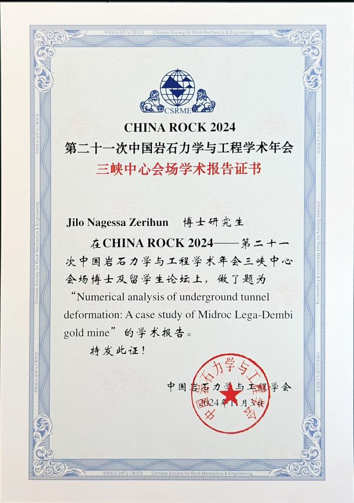 冰球官网罗忆研究员指导的两名留学博士研究生Mirza Iftikhar Ahmad和Jilo Nagessa Zerihun积极参与了“博士及留学生论坛”,并分别作了题为“Study on mechanical properties of reef limestone concrete”和“Numerical analysis of underground tunnel deformation: A case study of Midroc Lega-Dembi gold mine”的学术分享交流,展示了国际视野下的研究成果,进一步促进了跨文化学术交流和研究合作,提升了冰球官网在岩石力学领域的学术影响力。
