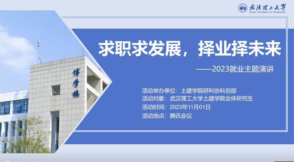 为帮助同学们提前做好职业发展规划、把握优质就业岗位,11月1日19点,由冰球突破豪华版官方网站研科协科创部举办的“求职求发展、择业择未来”求职就业主题讲座在线上成功举办。讲座邀请了20级优秀毕业生徐红玉、谢陈飞洋、葛倚兵担任本次主讲嘉宾,研究生辅导员卢文婧、李倩与超过200名研究生共同参与。