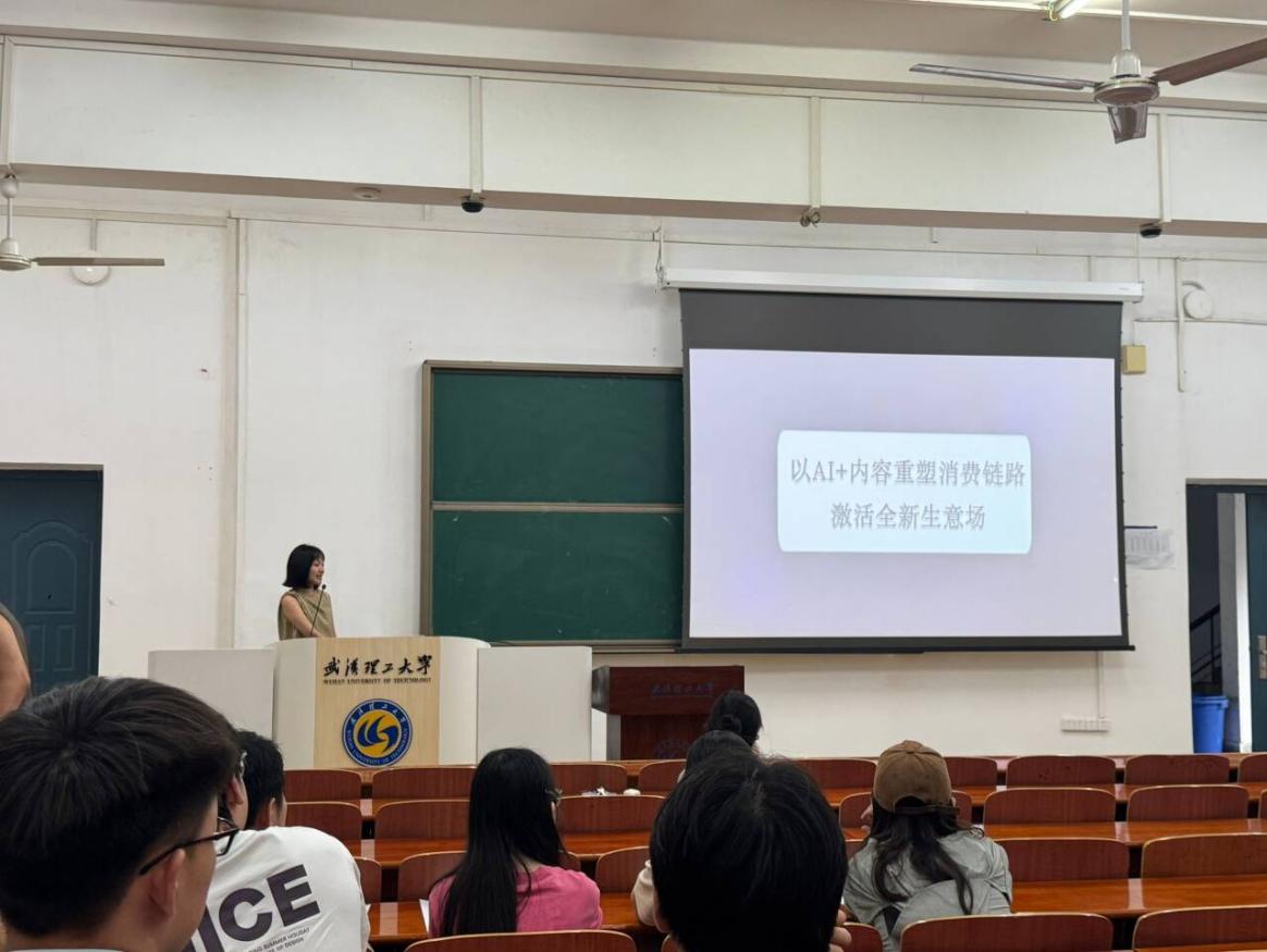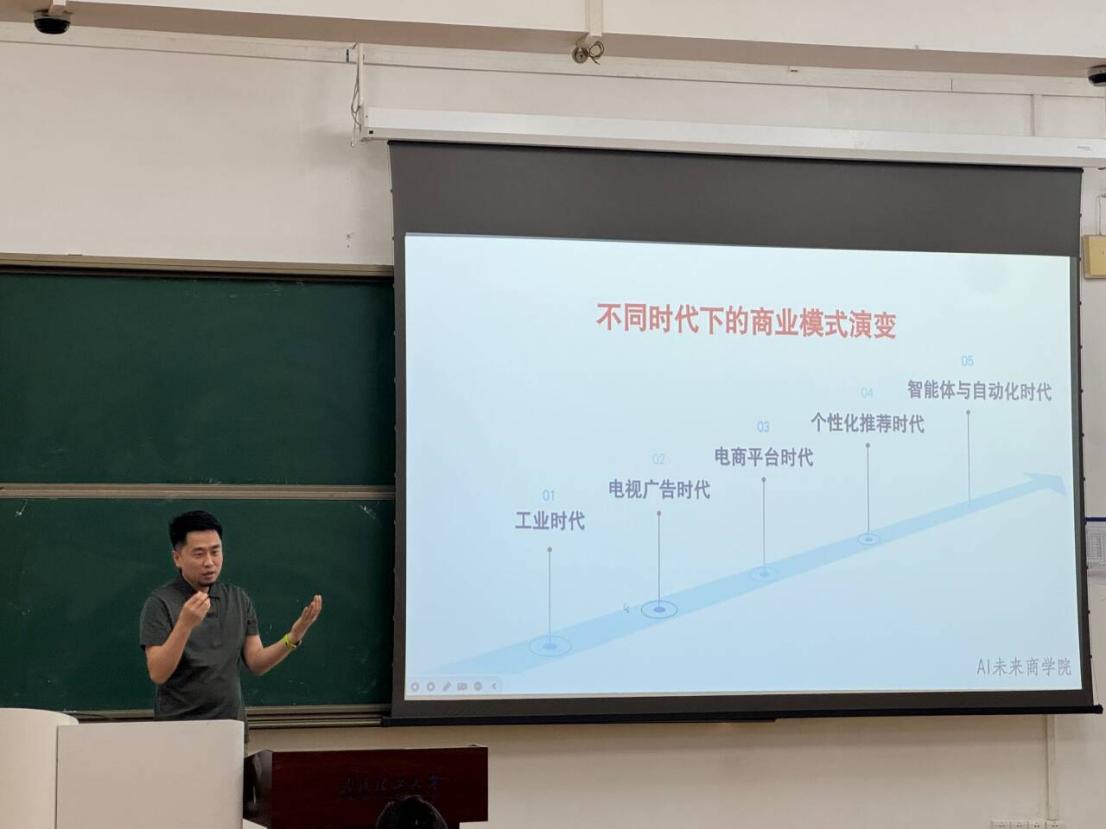首先,吴斯斯结合自身从传统行业成功转型AI领域的经历,为同学们展现了人工智能技术的广阔应用前景和职业发展的新路径。唐诗指出,AI是未来行业的核心赛道,不能用传统思维来理解。他结合近期小米Yu7汽车发布一小时收获海量订单的案例,阐释了在当今时代,产品契合客户需求、满足情绪价值与抓住流量的重要性。唐诗还从历史维度梳理了商业模式的五次演进——工业时代、电视广告时代、电商平台时代、个性化推荐时代以及智能体与自动化时代——鼓励同学们敏锐洞察时代机遇,积极投身AI浪潮。