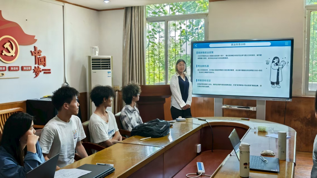 班会伊始,班长对当前规划相关专业的就业形势进行了分析。她指出,近年来我国城市进入存量发展,城市方面的工作机会和内容少,传统方向行情较差,但是国家稳就业政策密集出台,本专业也面临诸多新机遇,在国土空间规划、城市更新、乡村振兴等领域有着大量的需求。