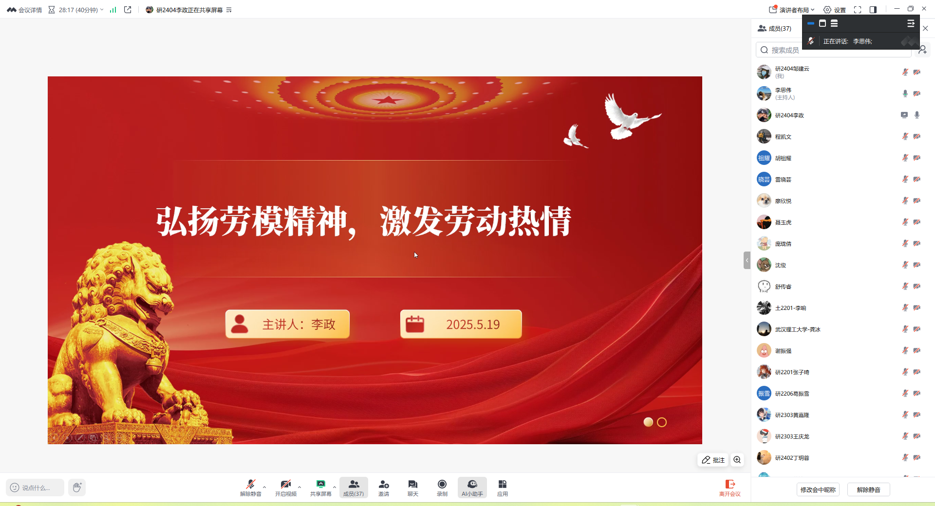 会上,李政同志从劳模精神的内涵与价值、劳模事迹与榜样力量、劳动精神的传承与发展、工匠精神的培育与弘扬几个方面进行分享。他说,全体党员必须高度重视和深入研究劳模精神、劳动精神、工匠精神,自觉传承并弘扬这些精神,书写属于我们这代人的奋斗篇章。