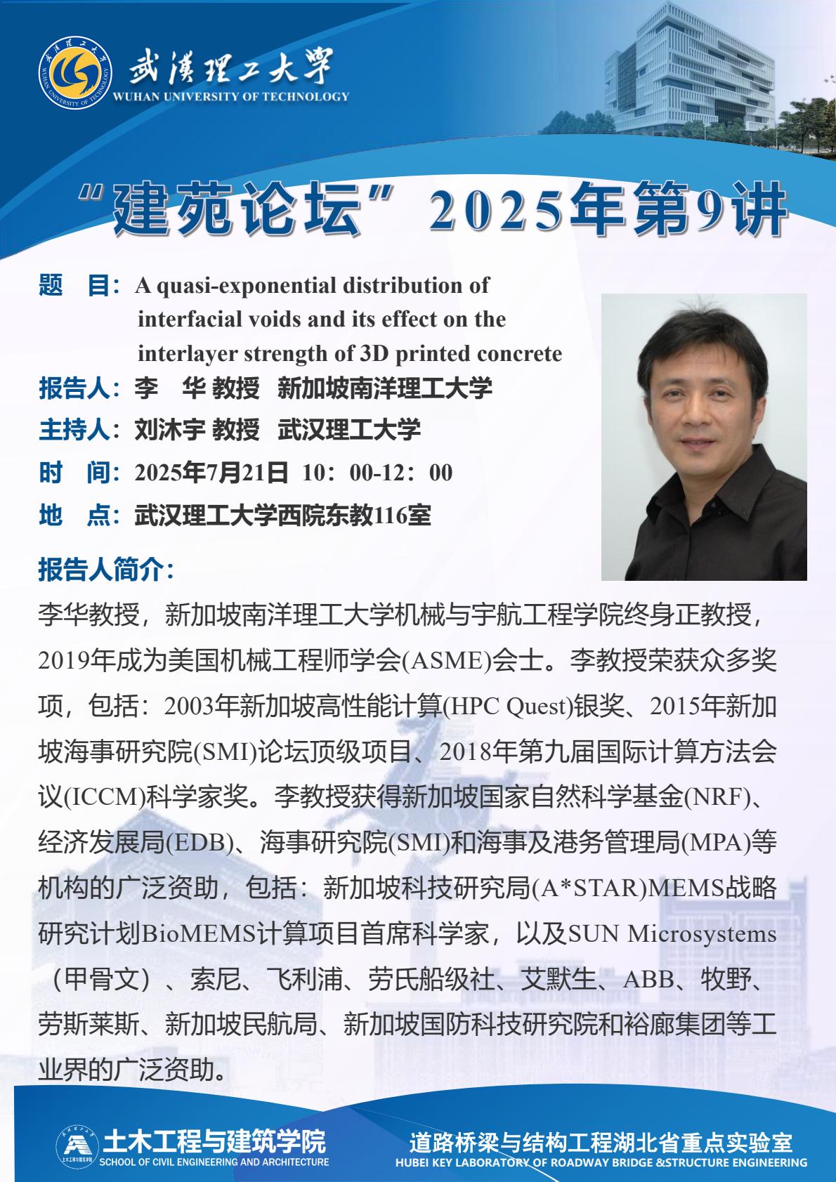 “建苑论坛”2025第8讲 主题:A quasi-exponential distribution of interfacial voids and its effect on the interlayer strength of 3D printed concrete