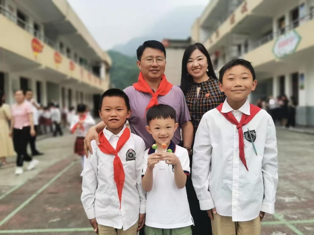 巫总夫妇带着儿子和流溪小学四年级小学生合影